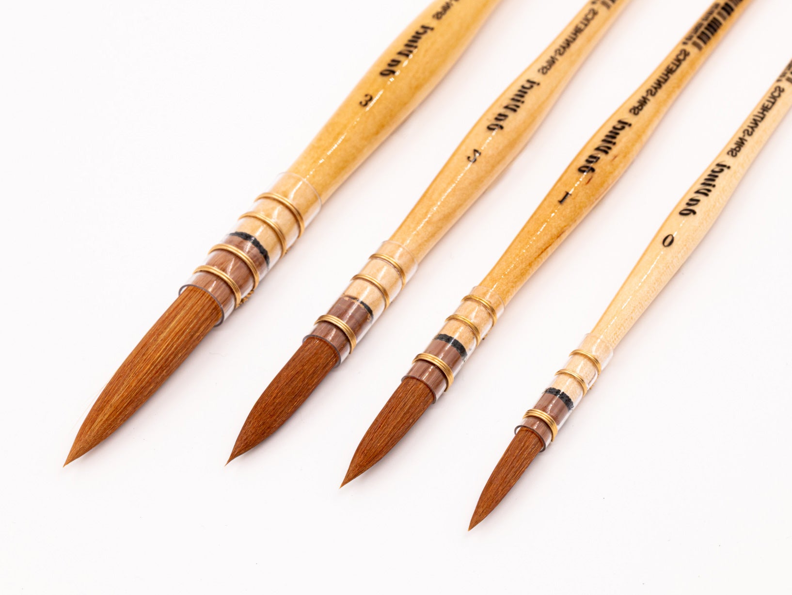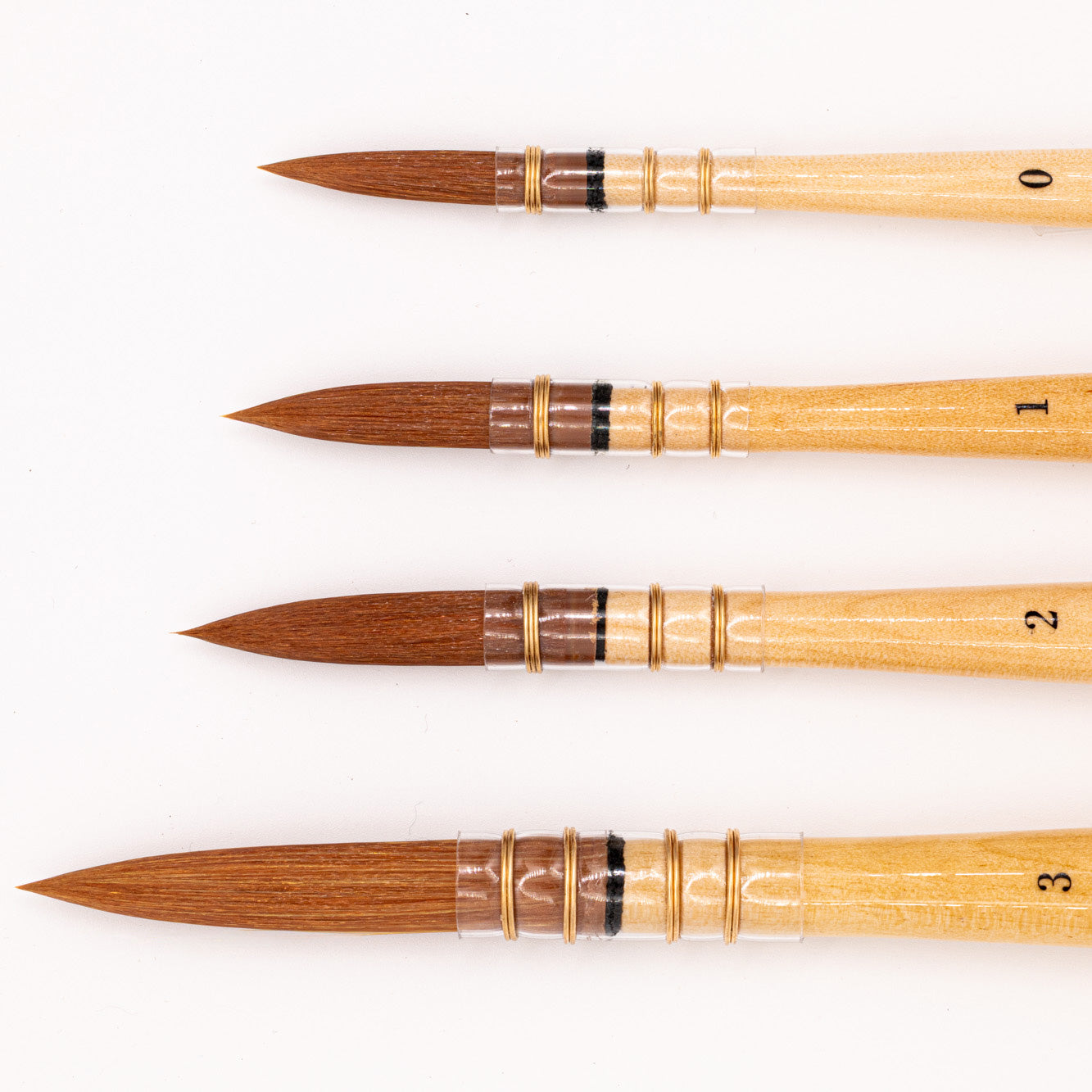 Een traditioneel aquarelpenseel in Franse stijl, gebonden aan een waterbestendige, transparant gelakte steel. Het combineert de veelzijdigheid die nodig is voor grote aquarelwassingen met de precisie die vereist is voor fijne details.