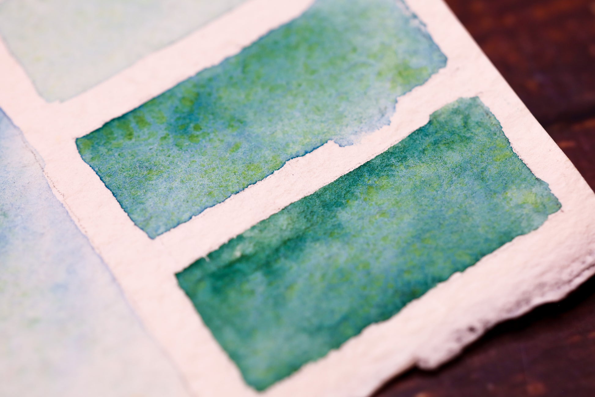 Votre commande est soigneusement emballée. Les godets d’aquarelle sont enveloppés dans une étiquette en papier Arches peint à la main, avec les propriétés des pigments indiquées sur les côtés. L’étiquette comprend une zone anti-adhésive pour éviter que la peinture n’adhère à l’étiquette ou à l’emballage.